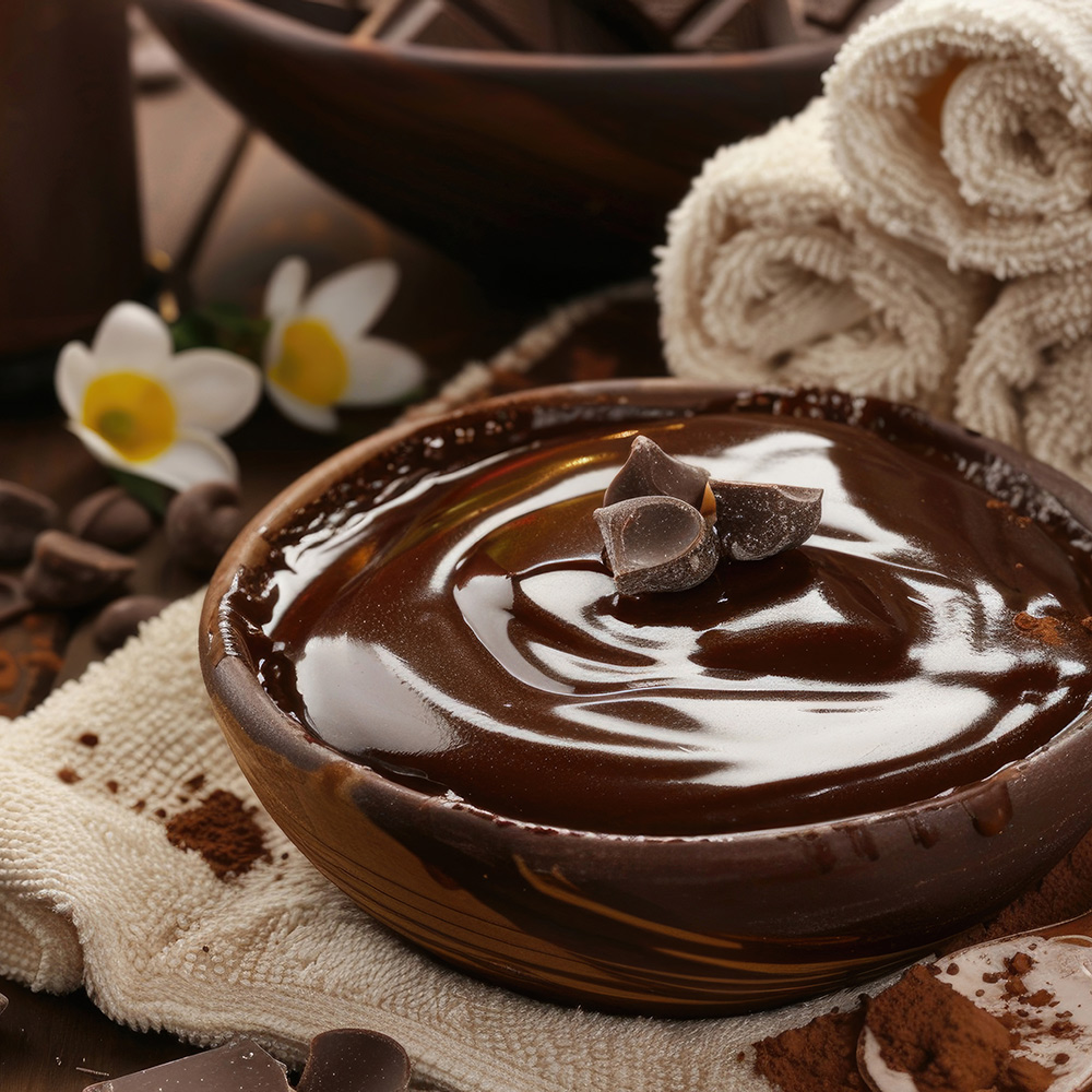Cacao 70 % con manteca y compresas calientes para potenciar absorción.