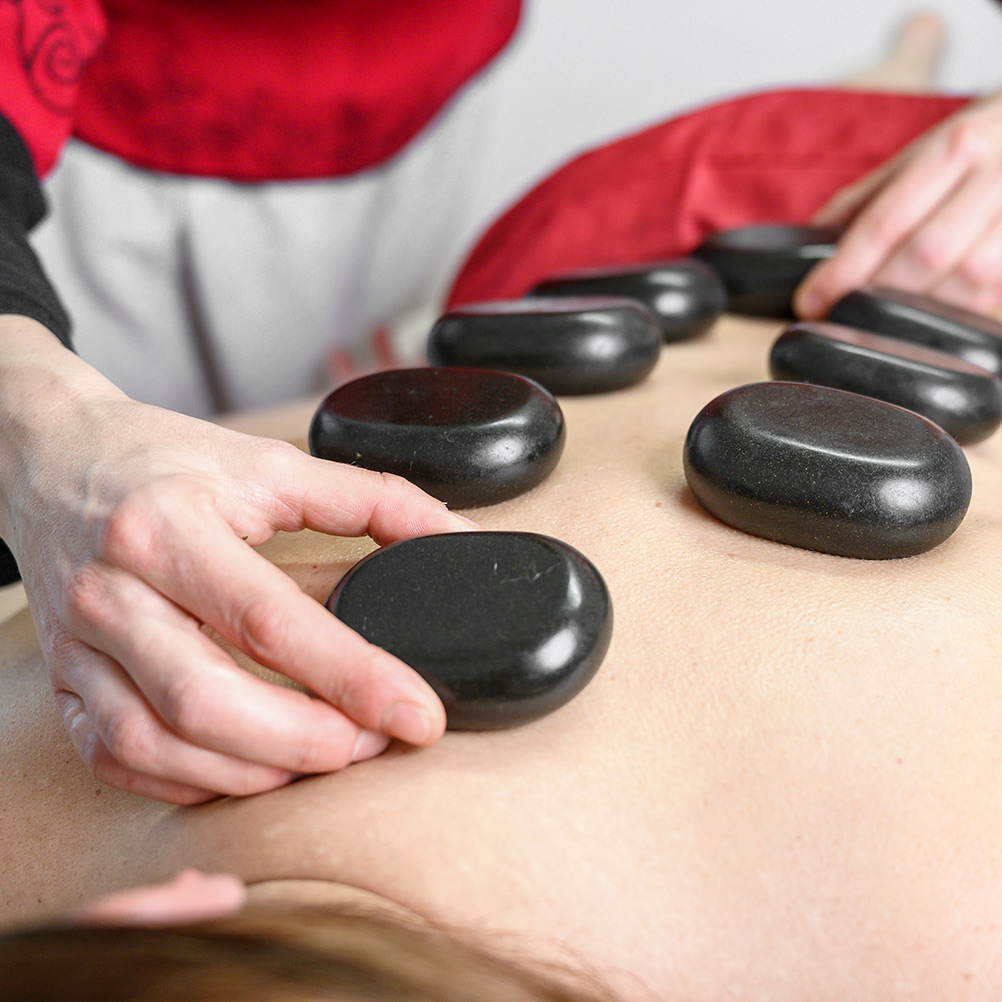 Uso de piedras volcánicas para relajar músculos y mejorar la circulación en combinación de masaje relajante manual.